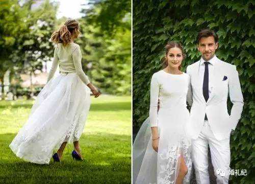 T恤,甚至针织衫搭配婚纱,也是一种随意范儿的选择。纽约名媛OliviaPalermo婚礼上,就是穿针织衫搭配前短后长的开叉裙。