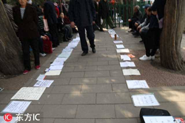 2017年4月9日,北京,北京中山公园“相亲一条街”上放满征婚简历。相亲者多是手持征婚简历的子女们的父母。(图片署名:东方IC/王徐)"