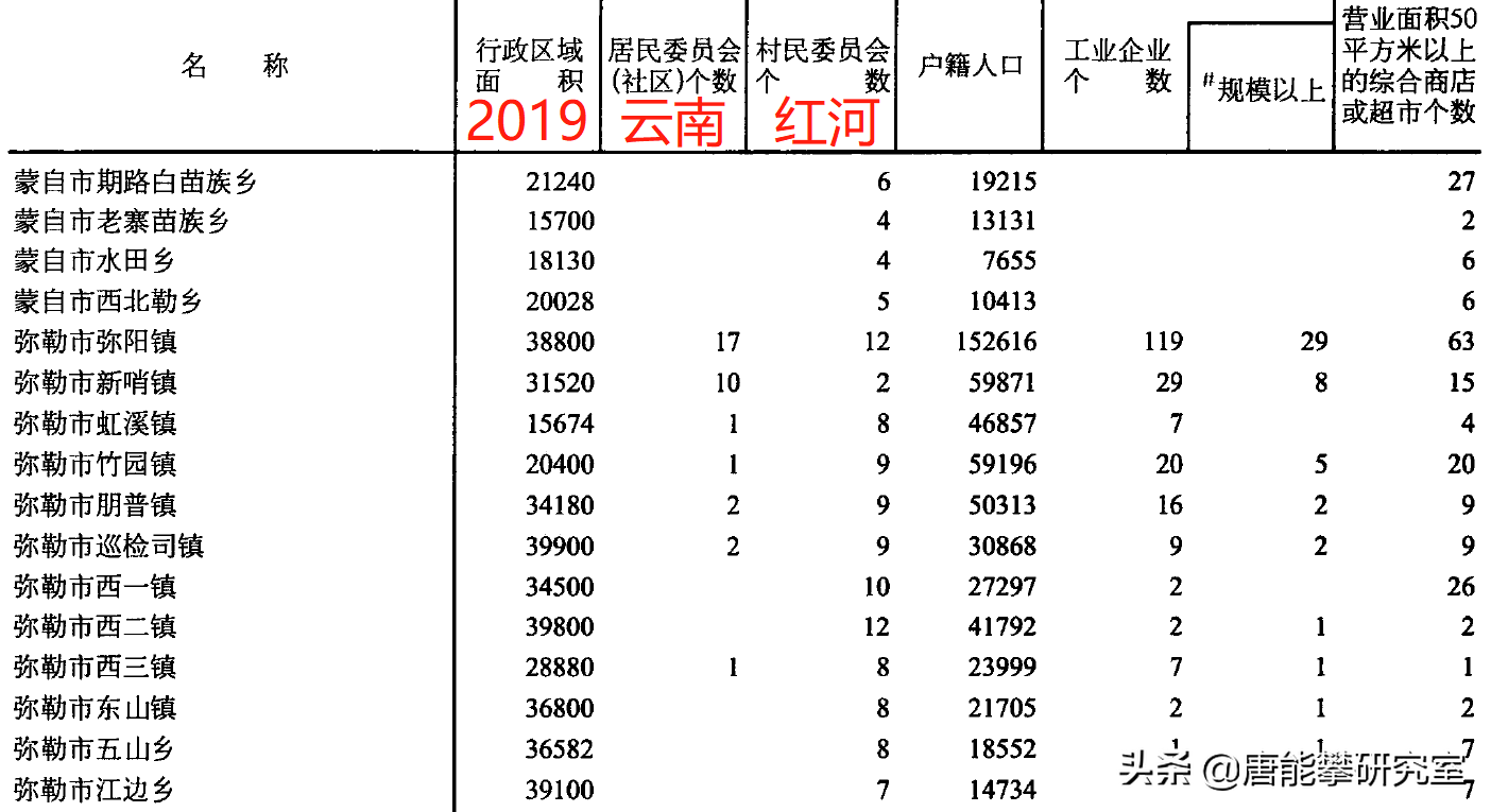除了地图上的变迁,将下面2019年度数据与上面数据进行对比,了解各镇近两年的变迁,一是乡镇数目的变化,二是乡镇人口、工商业的变化。