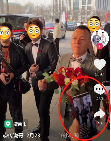 新郎传说哥出发迎亲前,该账号先晒出了迎亲车队,一眼望不到头的豪车阵容,还有画外音解说道:“传说哥婚车出发接新娘啦,现场几十辆劳斯莱斯”……