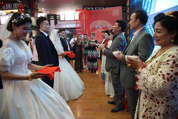 网新疆喀什(记者陆中秋)4月24日,喀什岳普湖县在达瓦昆景区为艾孜提力•吾布力、姆耶色尔,凯塞尔、玛尔比娅两对新人举行了婚礼。