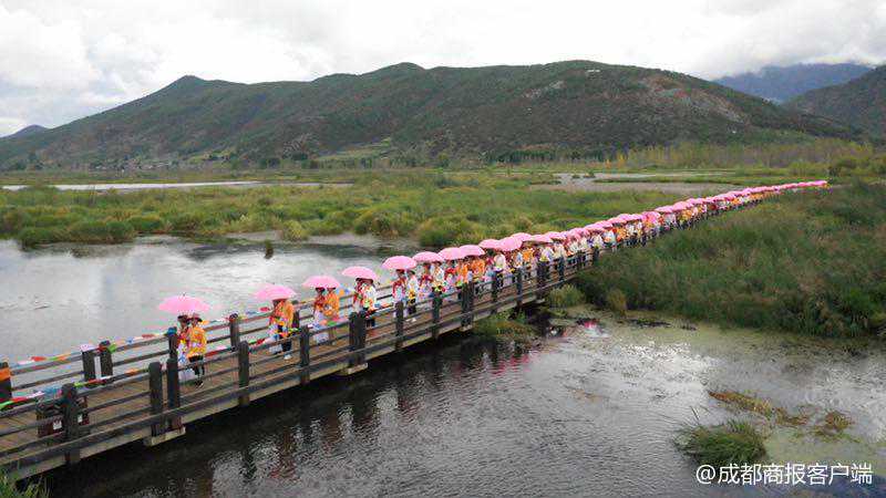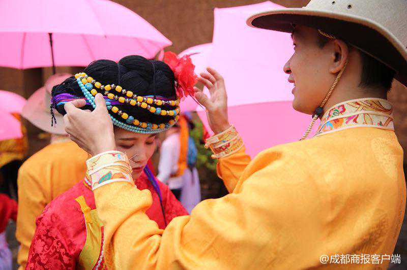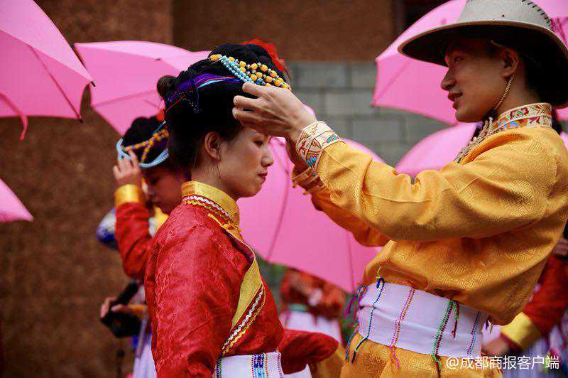 9月15日上午,66对情侣和夫妻在四川泸沽湖畔参加“筑梦山海间情定泸沽湖”——2018摩梭婚俗文化主题活动,体验摩梭人的“爱情仪式”,并留下永恒的爱的记忆。