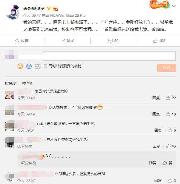 众所周知,骚男和七七在一起生活了七年,也就是大家所说的七年之痒,同时这位英雄联盟奥贝罗主播也是和自己的老婆在一起七年了,也担心自己七年之痒了,因此特意发了一条动态希望自己的老婆看到,并按时他的老婆以后不要控制欲太强了。并给送了自己老婆一首当前比较流行的歌曲《绿色》。