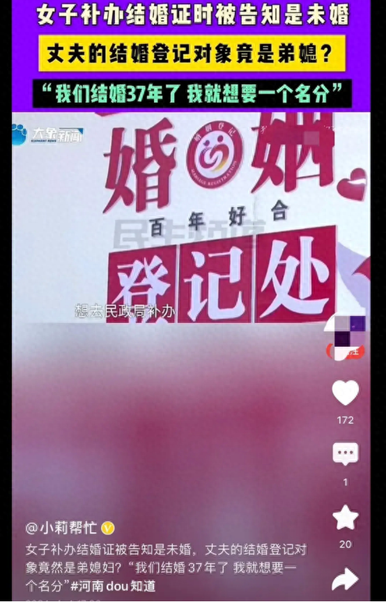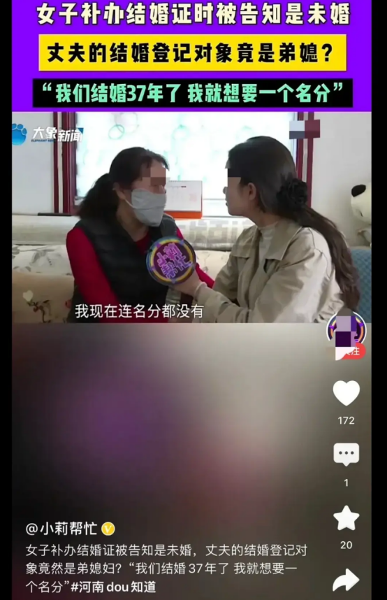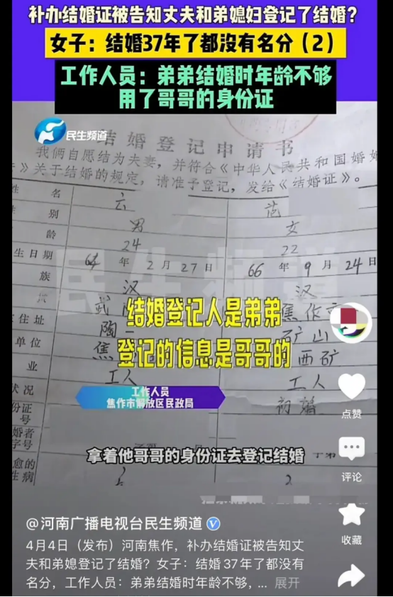 4月4日,河南焦作的孔女士和她的丈夫,在去民政局补办结婚证时,遇到了一个不可思议的事实——37年的婚姻竟然从未正式登记成功!更令人发指的是,孔女士丈夫的结婚对象,竟然是自己的弟弟!