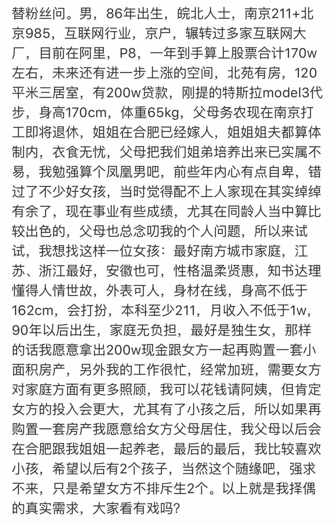 那么,我们来看看这个男子对女孩的要求,外表可人,身材在线,身高不低于162厘米,本科211,月收入不低于1万,90后出生,愿意生2个孩子。
