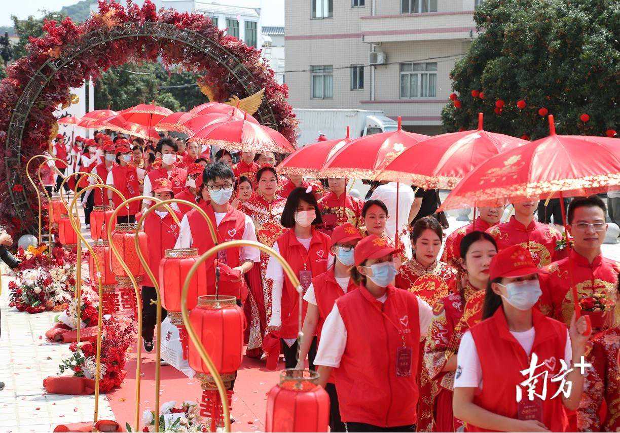与以往不同的是,本次集体婚礼采用新中式风格,运用“醒狮”“媒婆”“花轿”等传统文化元素,打造年轻人喜爱的特色婚俗文化打卡点,将传统和创新结合,进一步深化茂名荔枝爱情文化,倡导简约文明新风。