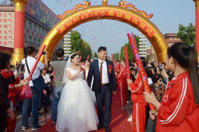 伴着神圣的《婚礼进行曲》和响亮的彩炮,身披洁白婚纱的新娘和西装革履的新郎,款步走上舞台。“执子之手,与子偕老,携手进步,为南街村的集体事业贡献力量。”主持人逐一宣读16对新人的名单及其“爱情誓言”,舞台巨大的LED屏幕上,同时播放着他们的婚纱照。