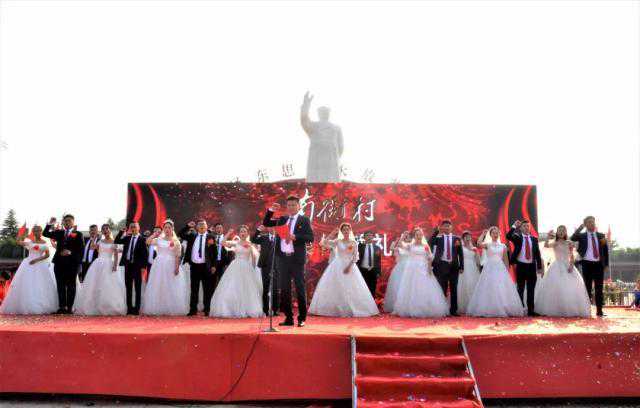 “我是南街村的新一代,我是南街村的接班人……”新人们喝下交杯酒后集体宣誓,并合唱了《没有共产党就没有新中国》和《南街村之歌》。