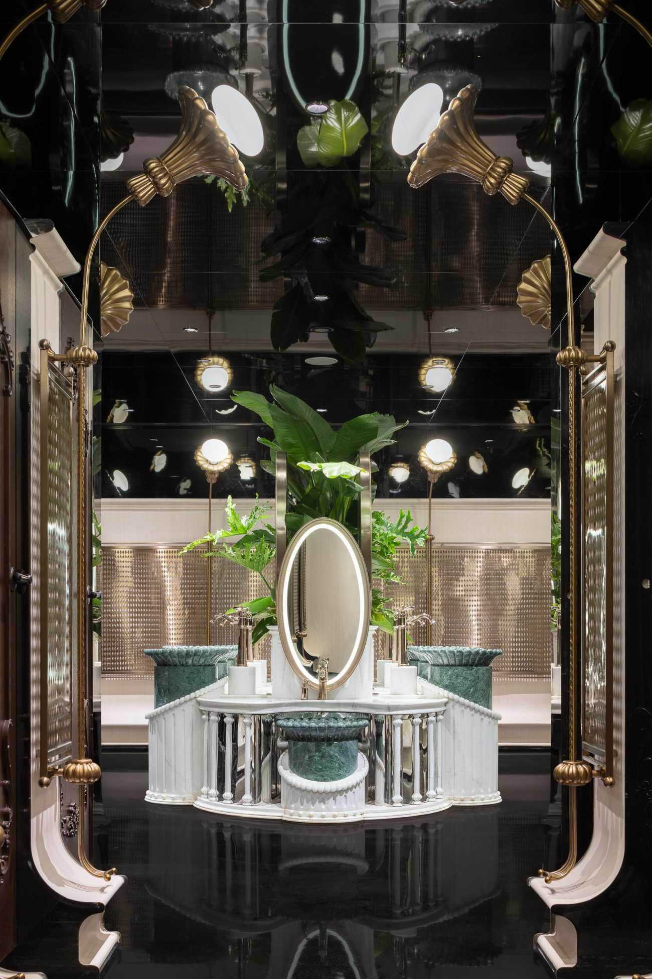 一进门,大量的绿植和插花映入眼帘,如果不仔细看,还以为经过了一家新开的餐厅又或者是艺术展的入口。墙体使用了双层设计,第一层为墨绿色的壁纸,金色格栅为其附上了第二层表皮,空腔内置入绿植,生机盎然。屋顶主要为金色、黑色和白色,以圆弧形的吊顶形状与地面相呼应,整体采用了装饰艺术风格(ArtDeco)。