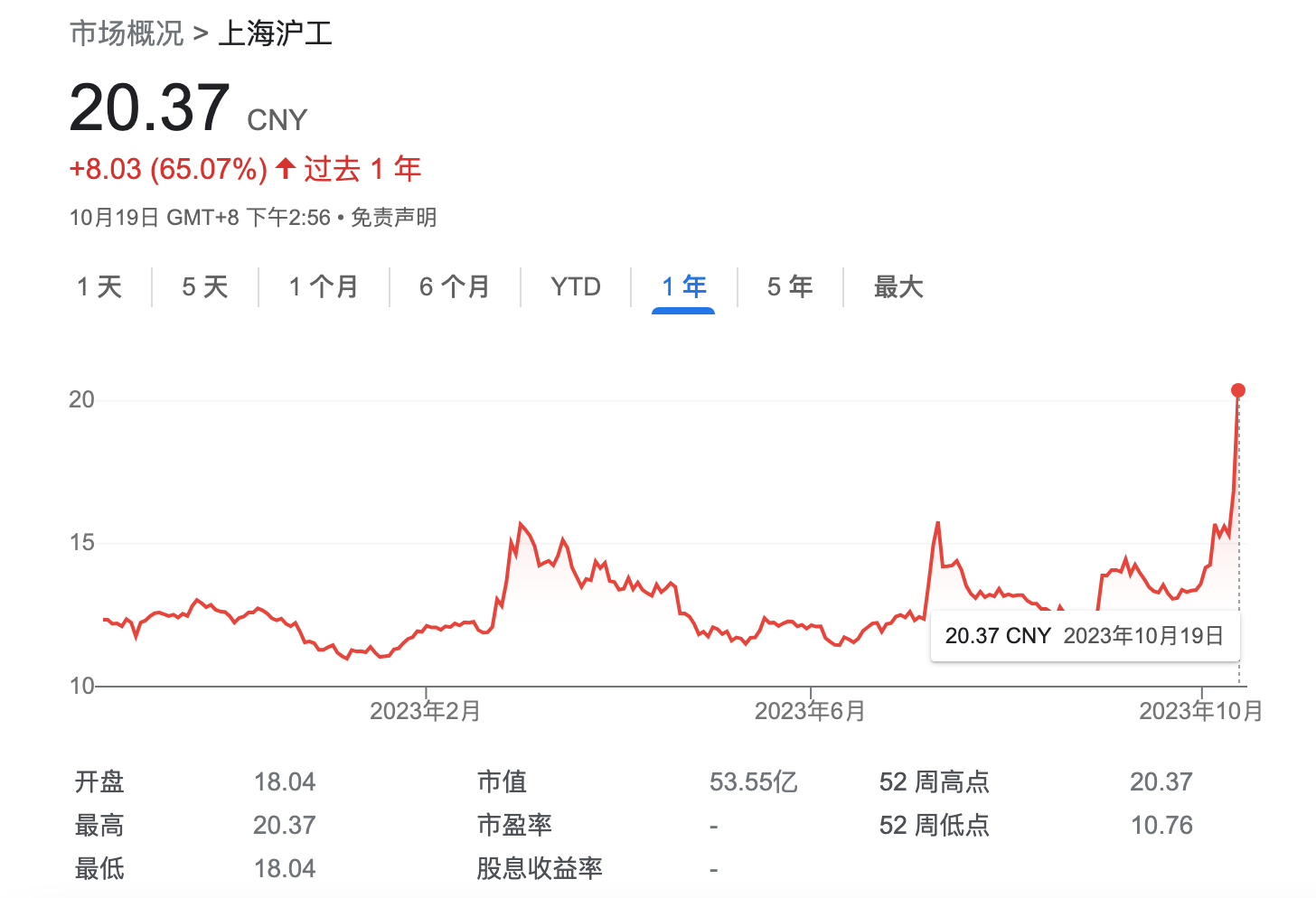 在二级市场上,上海沪工股价登至年内最高点20.37元。