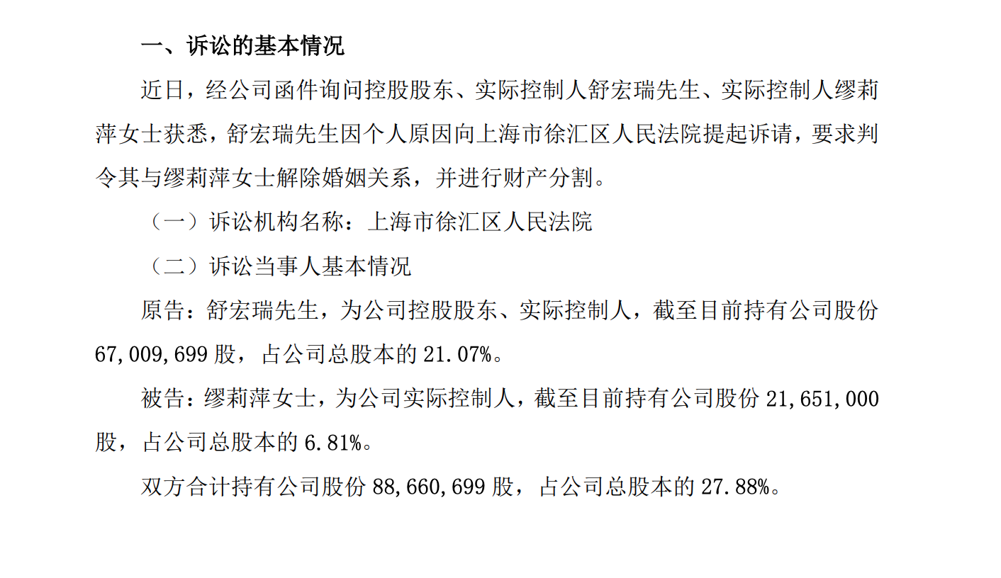 根据10月18日晚间公告,舒宏瑞近日因个人原因向上海市徐汇区人民法院提起诉请,要求判令其与缪莉萍女士解除婚姻关系,并进行财产分割。