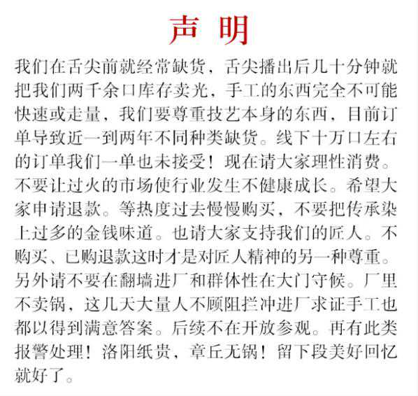 值得注意的是,声明中提醒大家:“不要把传承染上过多的金钱味道。”让我们戴上老花镜,从头再来读一遍:“不﹑要﹑把﹑传﹑承﹑染﹑上﹑过﹑多﹑的﹑金﹑钱﹑味﹑道。”嗯,确实没看错,章丘铁锅站在金钱的中心,开始想要穿上一件情怀的外衣了,而且把锅甩给了给他金钱缝制外衣的大众,神不知鬼不觉摞到大家背上的数口大锅乍看去,重量﹑角度﹑时间点都掌握得恰到好处,看来运营下了大功夫,据说这份声明早在节目播出前就已拟好,且在节目播出前就已启动了多个运营动作,那么问题来了,这一切注定会带来更多的金钱味道,铁锅自己难道不知道吗?