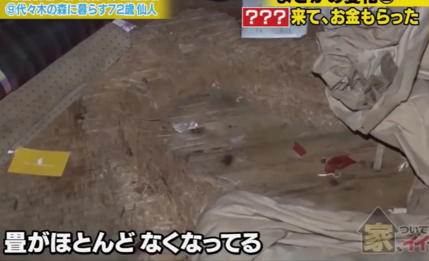 而老人就睡在垃圾堆里的被炉里,老人常躺的地方,榻榻米已经被磨秃露出了木地板