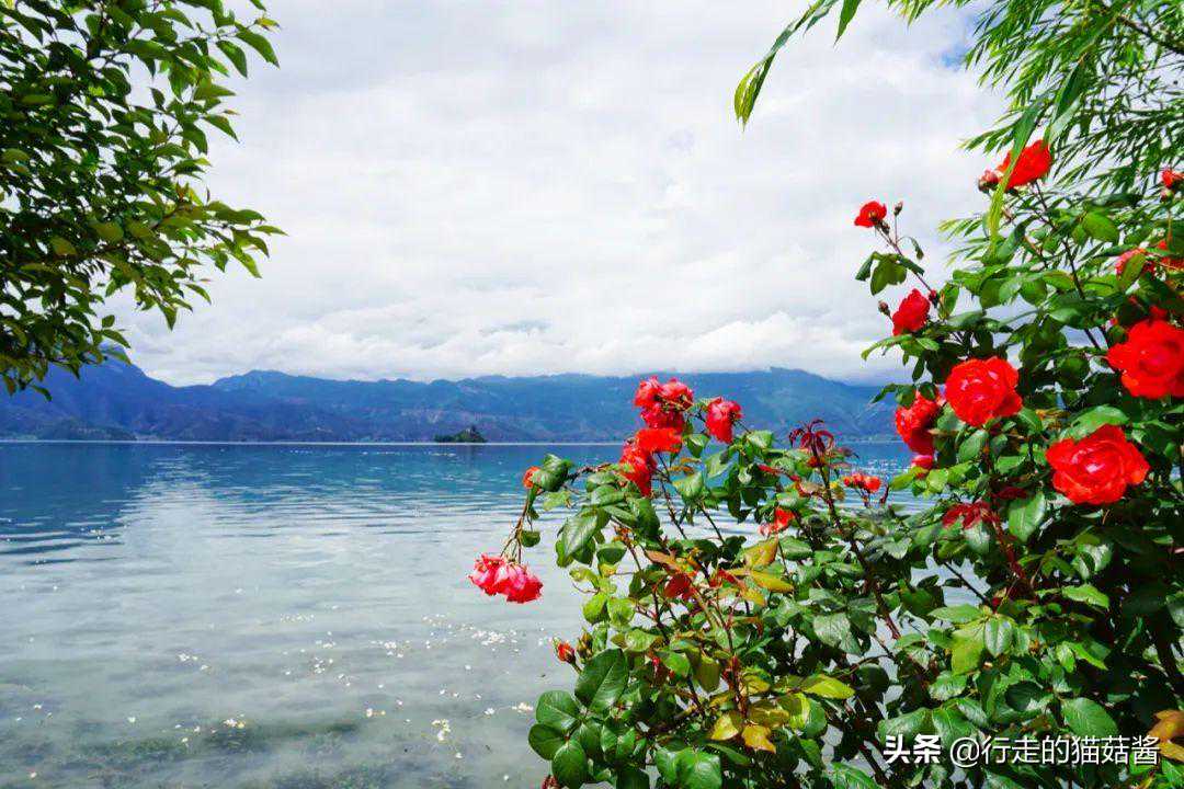 大落水是云南泸沽湖这边的游客集散地,乘坐客车什么的终点也是大落水,有各种吃饭和住宿的地方。大落水湖岸线很长,岸边有各种好看的花丛,也有很多十分上镜的白桌子、玻璃球,而且对面的狮子山也清晰可见。
