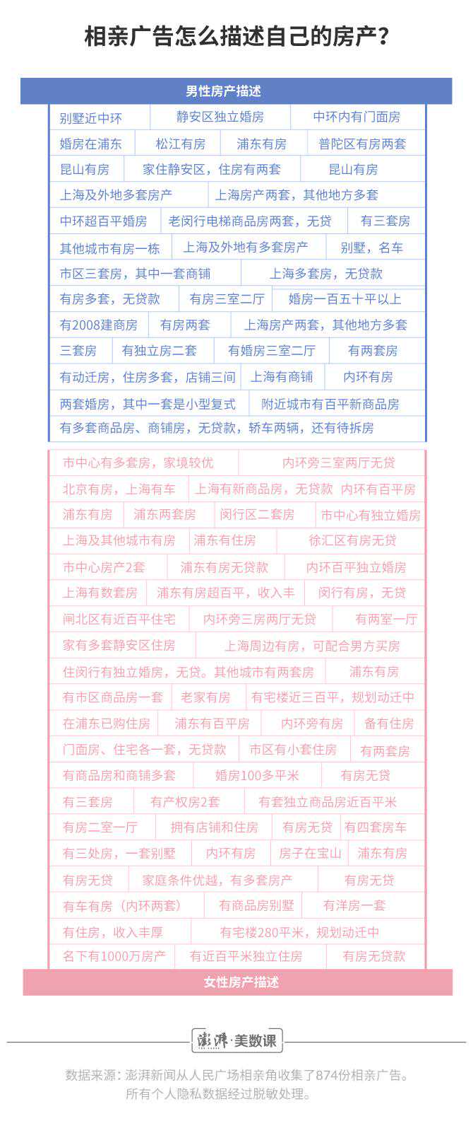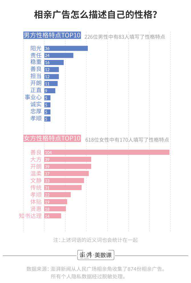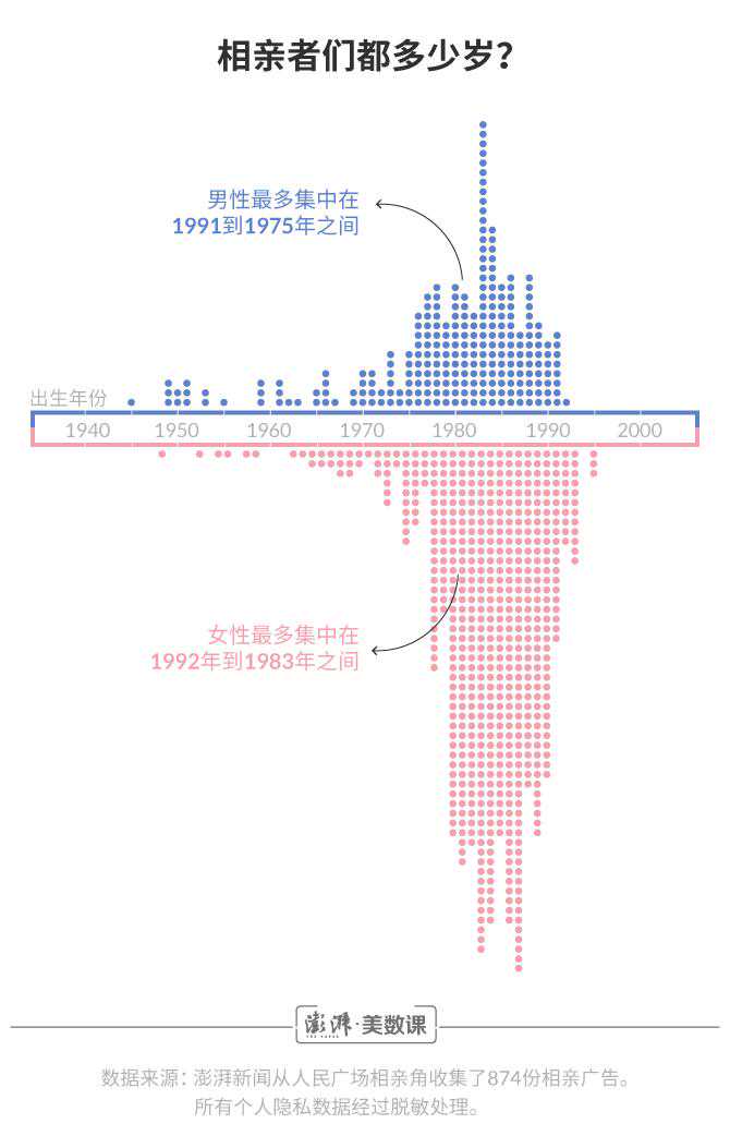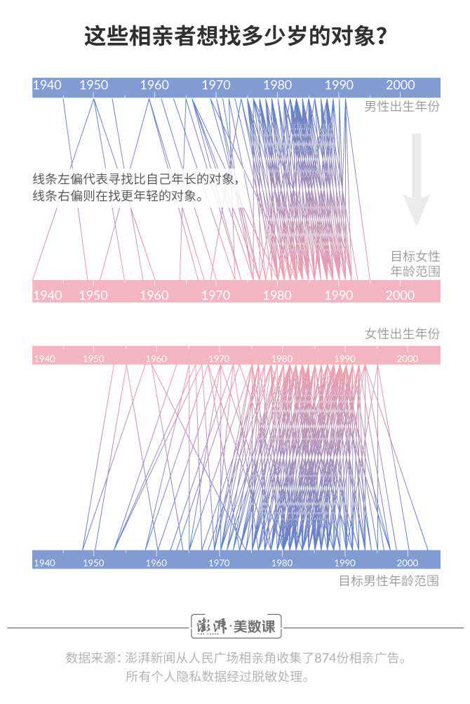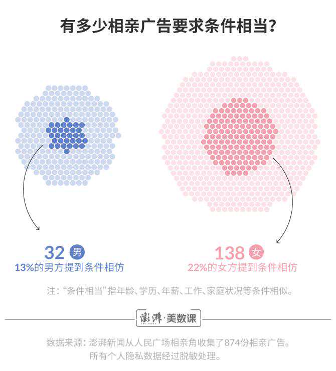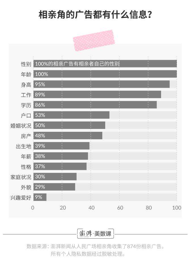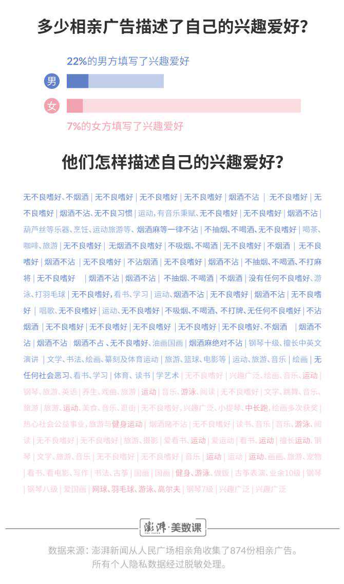 澎湃新闻()数据记者花费了六个周末的时间,收集了874份相亲广告。从中,可以读出关于618位女士和256位男士的觅爱故事。