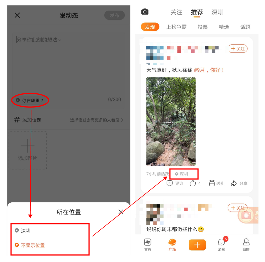 广场支持发布定位动态。比如小约不想一个人吃海底捞可能会社死+尴尬,此时发一条定位动态:我在xx路的海底捞,有空的饭搭子快来!这饭局不就支棱起来了~
