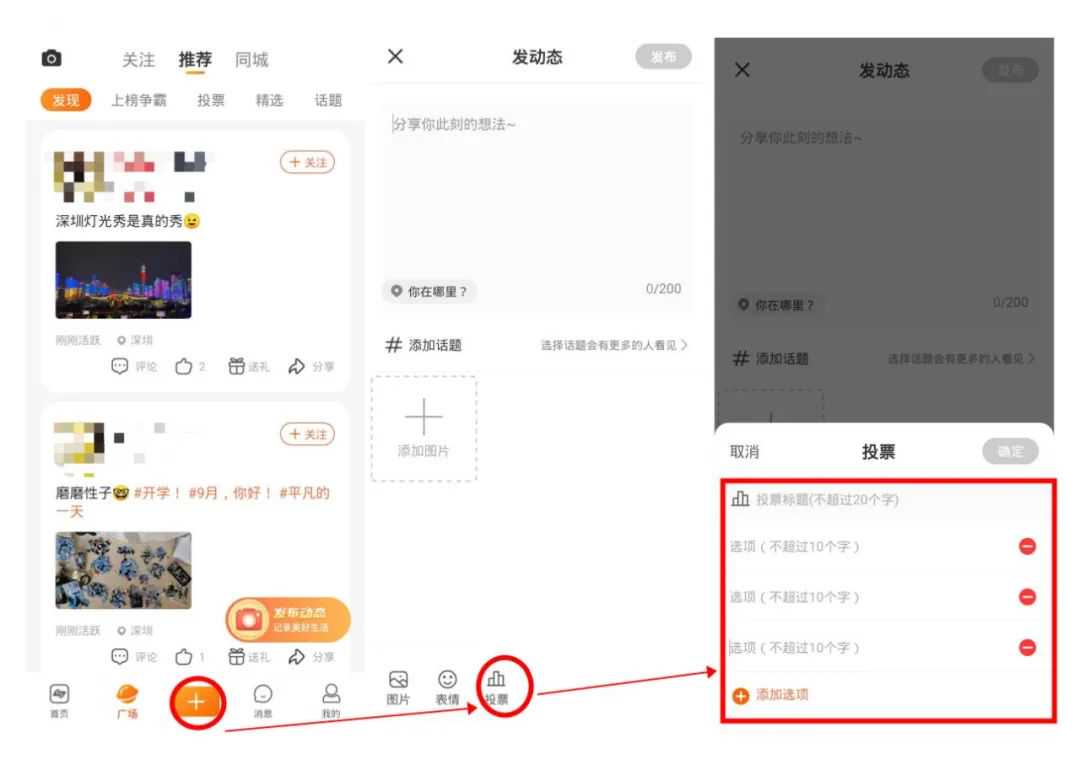 动态也能发起投票啦!设置你感兴趣题目和选项发起投票,比如问“豆腐脑要吃咸的还是甜的”就可以知道是否有人跟你饮食习惯相似。