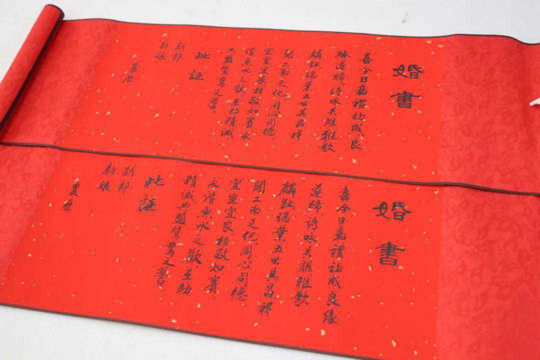 “起初写婚书是受朋友所托,为他们送上新婚祝福。后来觉得这也是一种文化传承,自己又喜欢,就想把它做下去。”宋兆炜告诉记者,目前,她书写的婚书词以民国时期的结婚证词为主要格式,可以书写在卷轴上,也可以书写在大小不同的纸张上,然后进行装裱。法律意义上的婚书最早出现在唐代,分正书和别纸,分别记录男女双方的真实情况。婚书到明清之后就简化许多,上面写有新人的生辰八字、聘礼,以及行礼的吉日吉时等。辛亥革命以后,便有了如今结婚证书的雏形,也就是宋兆炜现在所书写的形式。