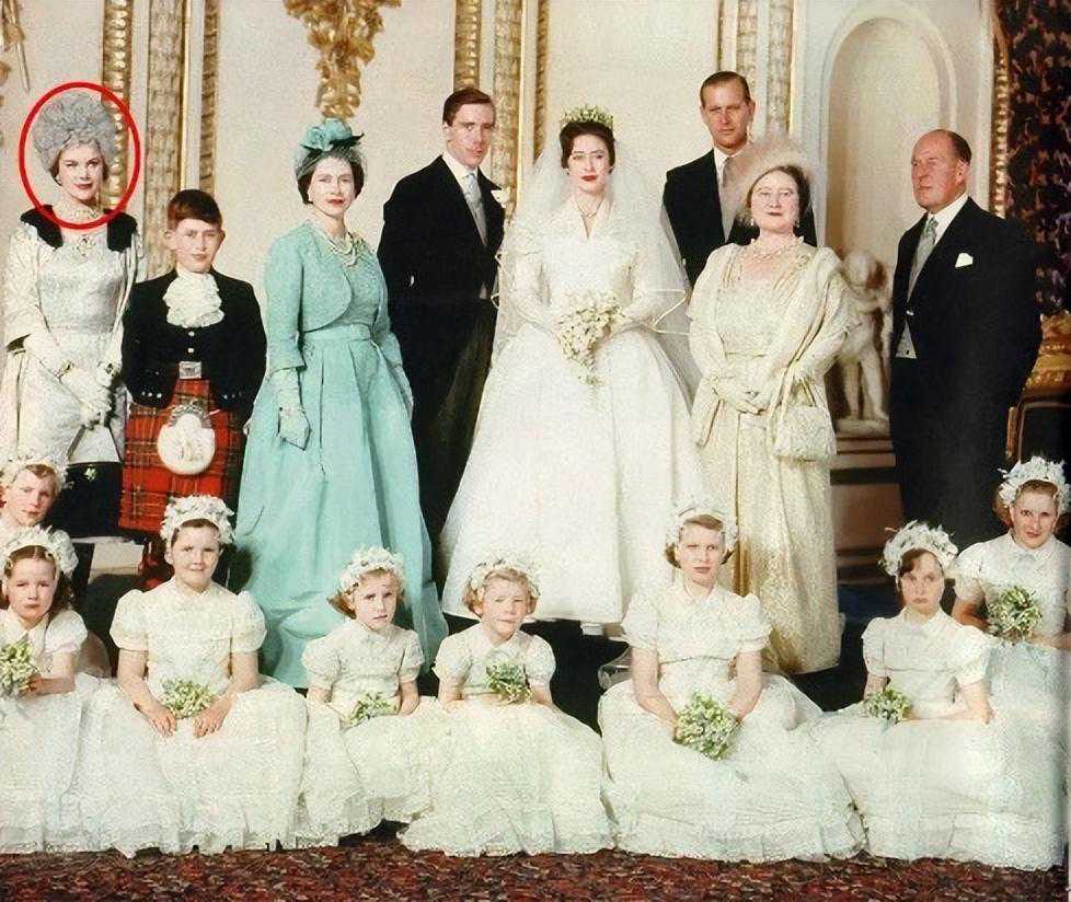 在新人的结婚合影中,人们看到女王带着自己的儿子查尔斯王储站在安东尼的左侧,而在查尔斯身边则是一位头戴蕾丝花束帽子的女性。