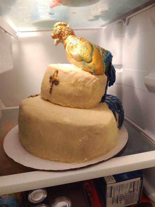但是,几周过去了,婚礼当天,戴维斯却傻眼了,这还是自己心心念念的美丽孔雀么?原本设计的蛋糕形象完全不复存在,展现在众人面前的简直是一只几乎要病死的火鸡,更为夸张的是,设计师被叫来修理蛋糕时,竟然把鸡头弄掉到了地上,客人们尴尬至极。当天的戴维斯不得不去其他商店另外找到了一些甜品作为替代。