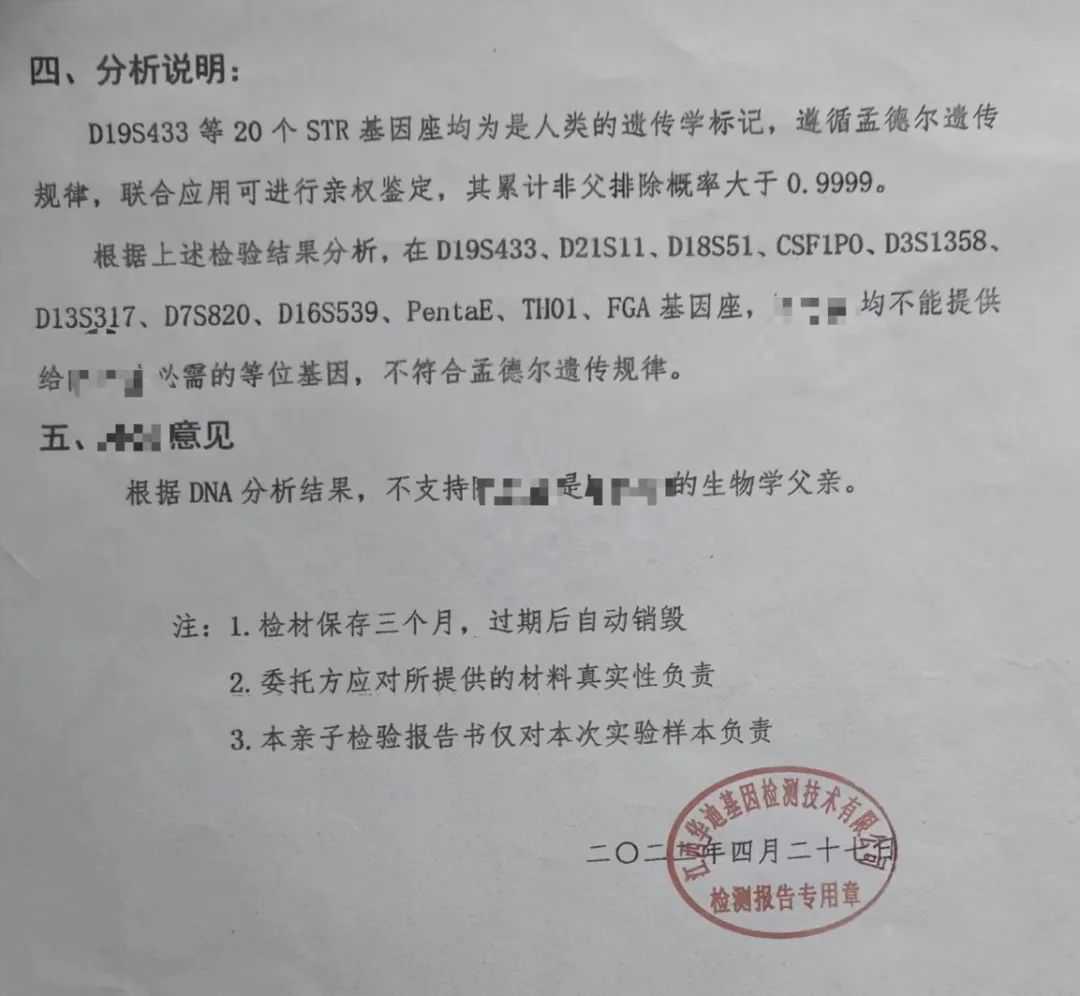 DNA鉴定报告显示小女儿与程文钧非亲生。图/受访者提供