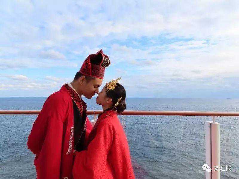 12月10日上午10点,行驶在蔚蓝色大海上的16.77万吨的诺唯真喜悦号邮轮上,一场特别的汉式婚礼大典正在进行,来自上海、广东、江苏、浙江、福建沿海五省市的8对新人,身穿传统汉式礼服,在汉式婚礼大典中的赞者和执礼官引导下,循古礼、立誓言、饮合卺、雀扇用印,演绎了一场庄严典雅的汉式婚礼。仪式结束后,新人们将定制的梦蔓亭喜糖分享给观礼的游客,在邮轮上拍摄汉服及婚纱照,参加婚礼喜庆宴席,新人们还兴致勃勃的体验了船上的娱乐活动。