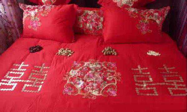 铺床一般由专人进行。床上需要有花生、桂圆、红枣、莲子、栗子等干果;鲜花:一般选择玫瑰或百合,起到装饰作用。
