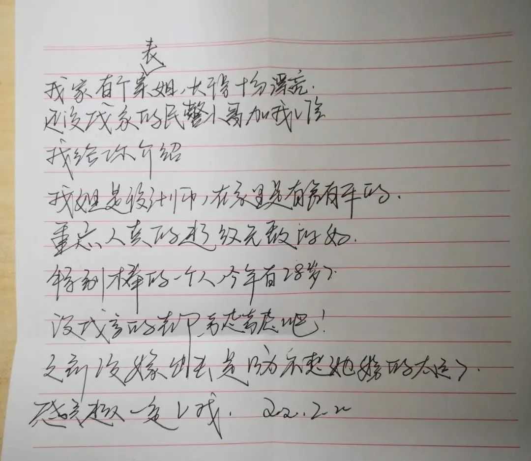 民警的热情服务深深感染了彭女士,回到合肥后,写下这封动人的感谢信。同感谢信一起寄来的快递中还有夹带着一封特殊的“征婚信”,原来这是彭女士为表姐“征婚”,还表示“未成家的警察小哥”可以联系她。