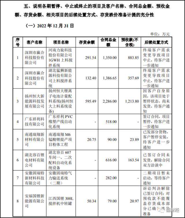 也因此宏工科技收到了深交所的问询,要求“说明各期暂停、中止或终止的项目及客户名称、合同总金额、预收金额、存货余额、相关项目的后续处置方式、存货跌价准备计提的充分性”等问题。