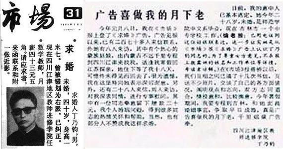 1981年1月8日,“第一则征婚启事”就这样诞生。不过,也考虑到政治风险,启事并没有刊发在《》上,而是登在《》社旗下刚创办不久的《市场报》上,编辑们低调地将《征婚启事》放在了一个不大醒目的位置。