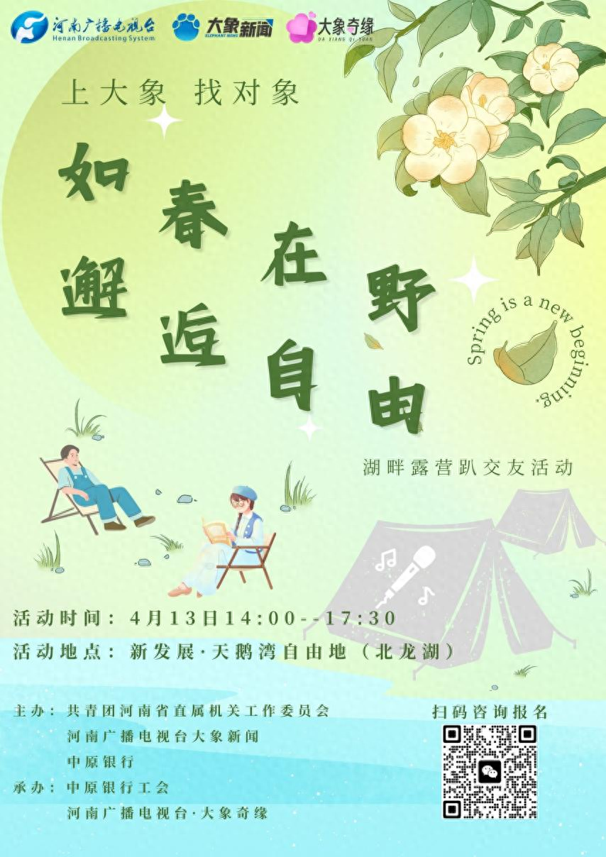 2024年4月13日,由共青团河南省直属机关工作委员会、河南广播电视台大象新闻、中原银行联合主办的找对象上大象丨“如春在野,邂逅自由”线下交友活动将在新发展·天鹅湾自由地举行。