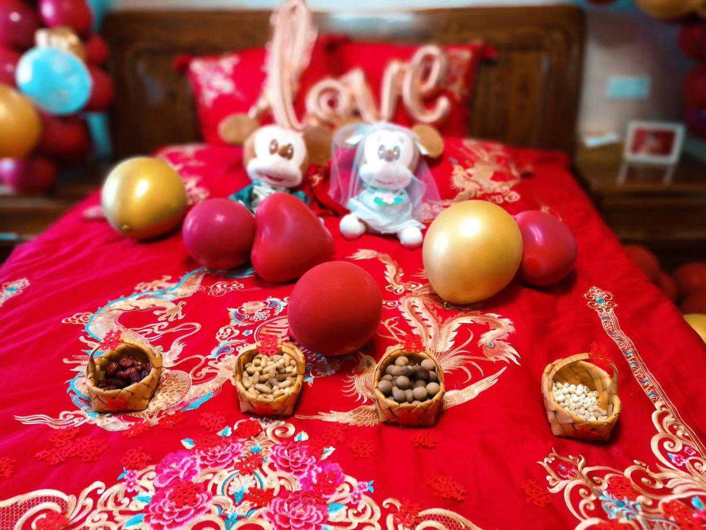 1、铺床作为婚礼的序曲,铺床是整个仪式的开端。铺床又叫“铺房”,指婚礼前一日,由专人为洞房进行布置的仪式。安床习俗:床门向窗,衣柜顺堂,门不对柜,镜不向床。安床分铺床、升帐、开铺等步骤。床上用品:一般选择红色,要求床上要有四床被子(女方娘家嫁妆里有)、四床褥子、两对枕头、两对靠垫等十八件物品。铺床物品:床上需要有花生、桂圆、枣子、花生……等干果,象征早生贵子。铺床时间:迎亲前一日邀请“牵娘”为新人进行铺床。