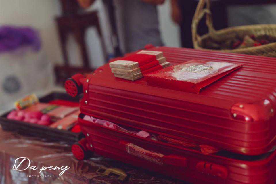 3、出嫁本地新人出嫁一般都为上午出嫁,上午回门。也有吃过午饭,下午出嫁的。由女方父亲或弟弟准备出嫁物品,将新娘的随身衣服、出嫁衣服、嫁妆、银行卡、现金等锁进红箱子。同时,一对新人用富贵碗吃红枣茶(寓意早生贵子),同样是由全福人准备,新人喝完茶在碗下各压一个红包,感谢福奶奶。新娘穿着父亲的鞋走到婚车,意为不带走女方的泥土,建湖、阜宁、滨海地区还有新娘打红伞的习俗,用意趋福避祸。出嫁时,女方若有送亲人员,婚车上人数需成双(包括司机)。回程与来时路线不重复,即不走回头路。若路过桥还需抛硬币,同样意为趋福避祸。
