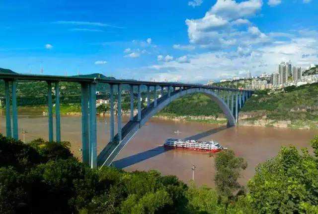 长江上第一座单孔跨江公路大桥,也是世界上最大跨径钢筋混凝土拱桥,同时也被誉为世界拱桥的里程碑。